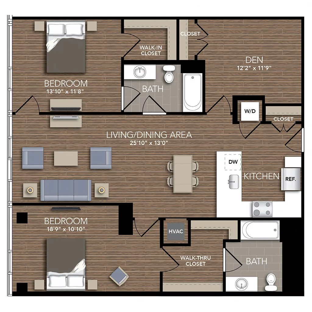 Rendering of the B3 floor plan with 2 bedroom[s] and 3 bathroom[s] at Union Place