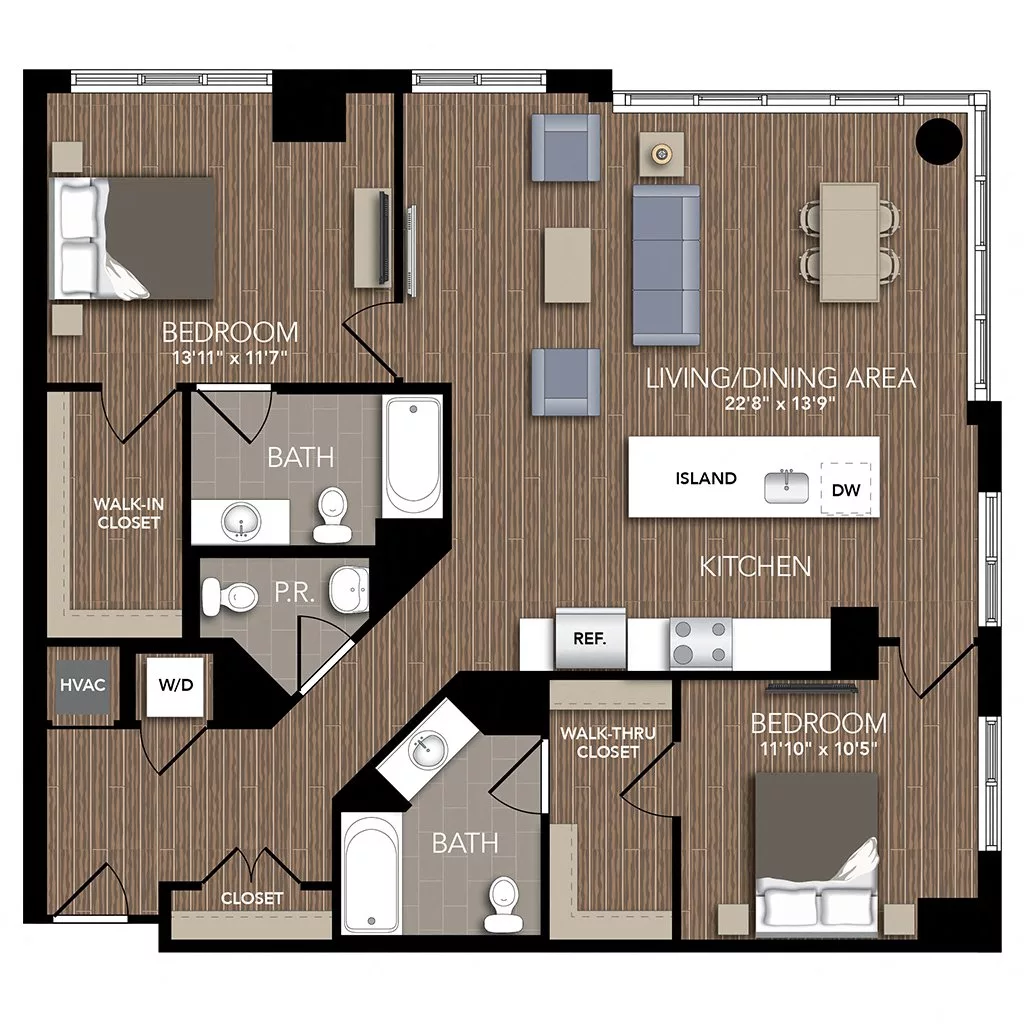 Rendering of the B1 floor plan with 2 bedroom[s] and 2 bathroom[s] at Union Place